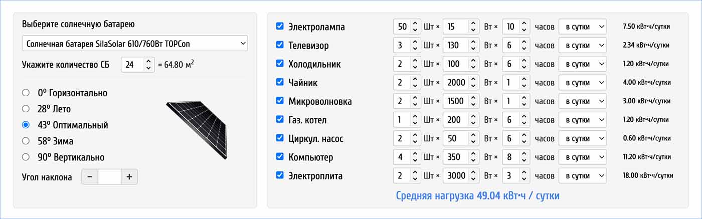 Примечание: Все расчеты являются примерными, для правильного и сбалансированного подбора систем автономного электроснабжения под Ваши нужды, необходимо обратиться к менеджерам нашей компании или заполнить и отправить заявку на расчет солнечной электростанции.